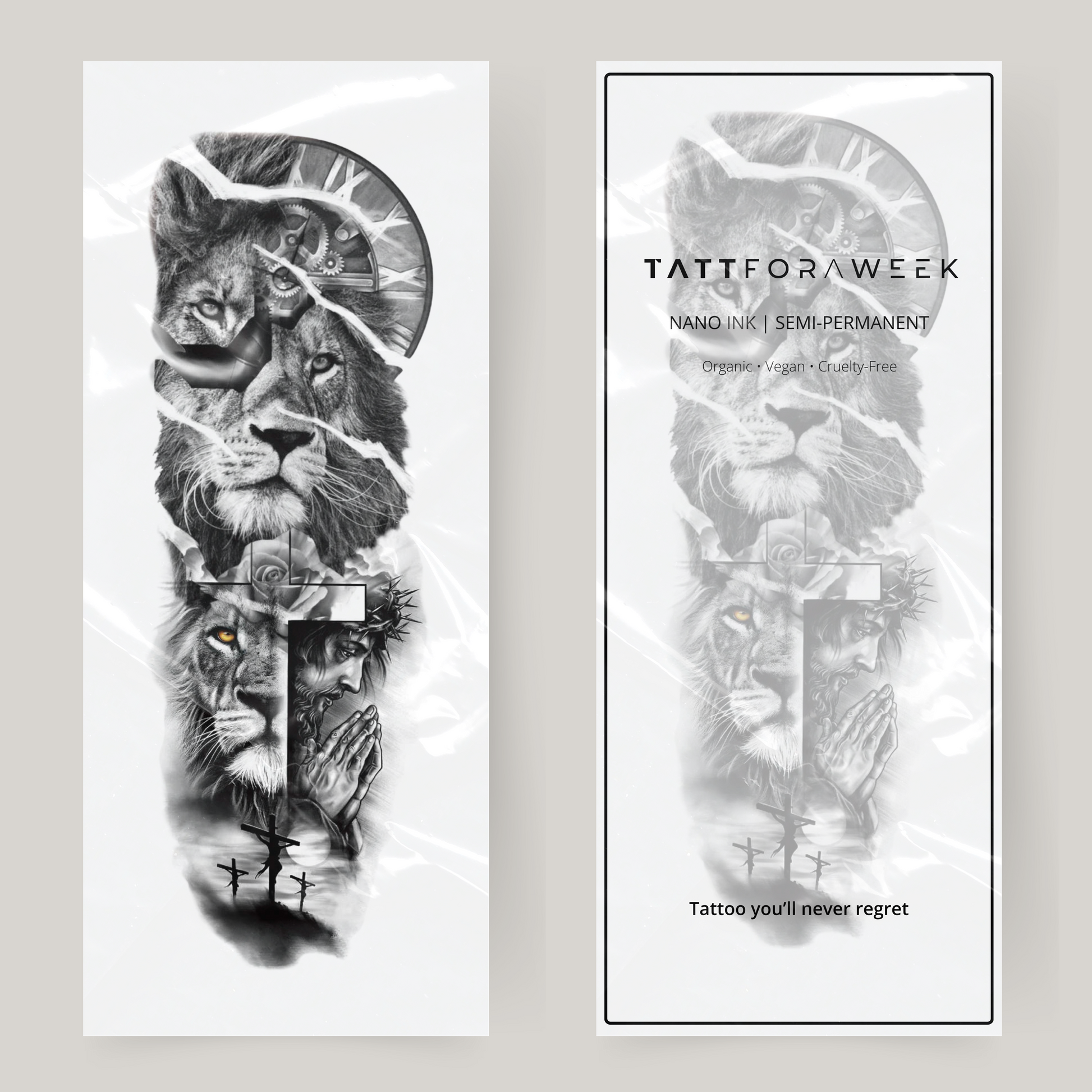 Leone, fede e orologio sulla manica del tatuaggio finto